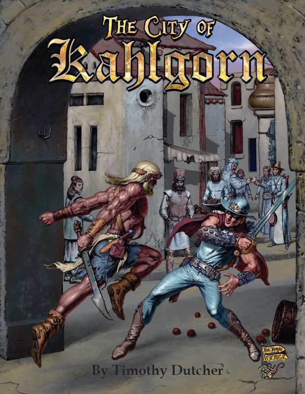 This source book details a city which can be used with any fantasy role playing game. It lays out the details of Kahlgorn, a bustling river city on the edge of the barbarian wilderness. Some effort will be required by the game master to express the characters, location, and adventures outlined within in terms of the rules being used. Sixty-nine city locations are detailed and seventeen of those locations are fully mapped Nineteen key personalities are presented with detailed backgrouns and numerous other personalities are presented in brief, typically in association with various locations. Six adventures are outlined to provide a game master with a starting point for running adventures in and around the city.